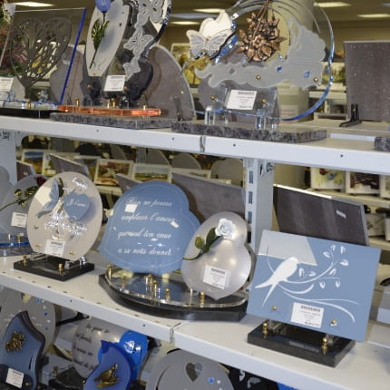 Nos agences funéraires proposent un choix très varié d’articles massifs ou discrets pour personnaliser l’hommage ou le message de la sépulture du défunt.